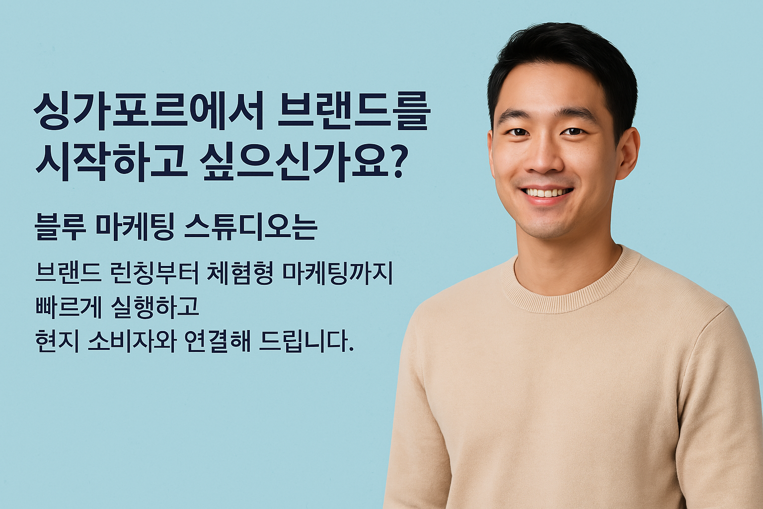 미소 짓는 남성 모델 – 블루 마케팅 스튜디오가 싱가포르에서 한국 브랜드를 실행하는 메시지를 설명하는 배경과 함께